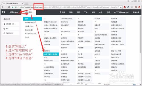 1、打开阿里云并登录,找到控制台,然后选择“产品与服务”→全部→CA证书服务(数据按… ,然后点击进去